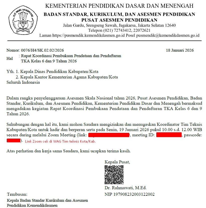 Disampaikan dengan hormat, merujuk Permendikdasmen Nomor 9 2025 tentang Tes Kemampuan Akademis (TKA), Kepmendikdasmen Nomor 95/M/2025 tentang pedoman penyelenggaraan Tes Kemampuan Akademis (TKA) dan Perkaban Nomor 045/H/AN/2025 tentang kerangka Asesmen Tes Kemampuan Akademis (TKA) jenjang SMA/MA/Sederajat dan SMK/MAK.